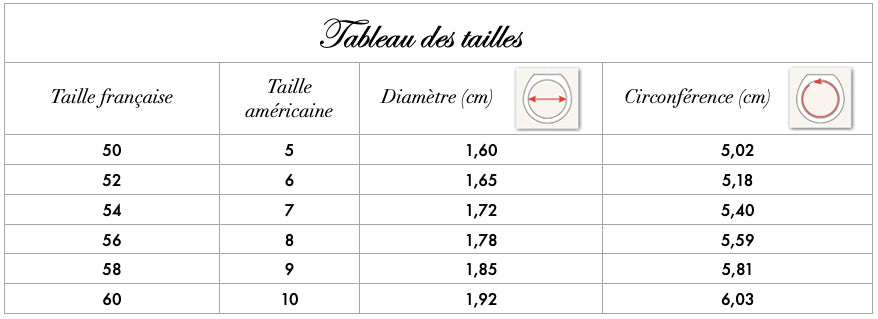 Pour déterminer votre tour de doigt, vous pouvez prendre pour modèle l’une de vos bagues, de la dimension désirée, et mesurer son diamètre intérieur à l’aide d’une règle millimétrée.